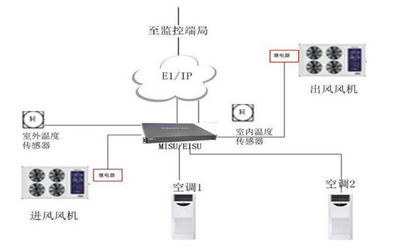 總體思路為:脫離(拆除)通風(fēng)系統(tǒng)控制器,保留進(jìn)風(fēng)風(fēng)機(jī)和出風(fēng)風(fēng)機(jī),通過加裝繼電器進(jìn)行開關(guān)動(dòng)作,而繼電器接入DO通道進(jìn)行控制;室外溫度傳感器接入AI通道進(jìn)行檢測,(原有室內(nèi)溫濕度傳感器和空調(diào)默認(rèn)已接入)。通過局端配置參數(shù)和公式來判斷基站環(huán)境是否滿足工作條件,并根據(jù)判斷結(jié)果通過DO通道選擇性控制風(fēng)機(jī)或者空調(diào)運(yùn)行。