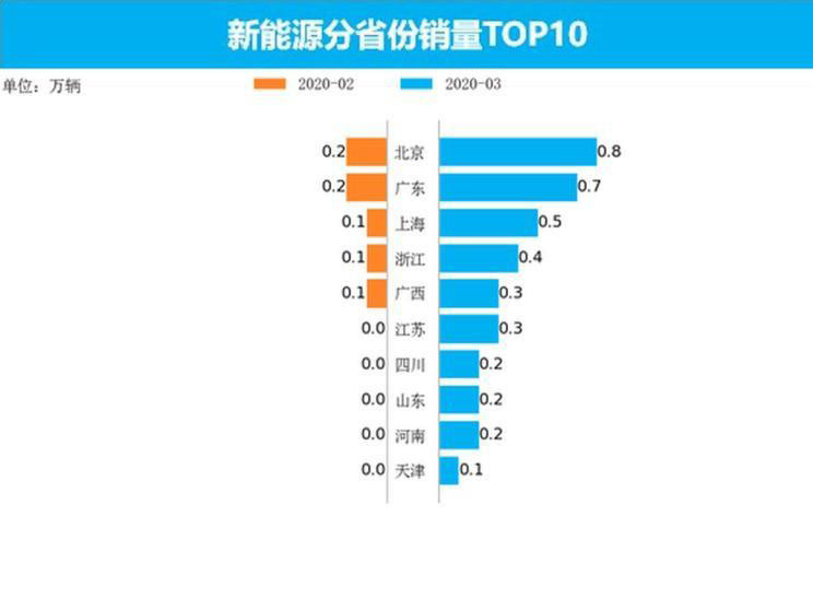 3月新能源車銷量最高的5個(gè)省份為北京、廣東、上海、浙江、江蘇,銷量分別為0.8萬輛、0.7萬輛、0.5萬輛、0.4萬輛、0.3萬輛,占總銷量的59.2%。與上個(gè)月相比,上漲幅度最高的三個(gè)省份為新疆、內(nèi)蒙古、陜西,上漲幅度分別為8900.0%、3300.0%、1632.6%,未來經(jīng)濟(jì)發(fā)展型省份的新能源市場優(yōu)勢或會(huì)進(jìn)一步擴(kuò)大。