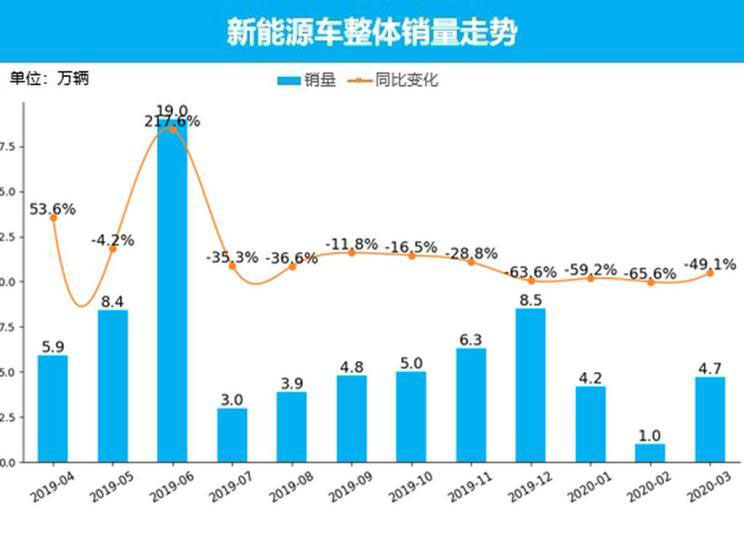 從整體新能源市場銷量情況來看,2020年3月,新能源車共銷售了4.7萬輛,占整個(gè)市場銷量的4.5%。與上個(gè)月相比,新能源車銷量環(huán)比增長388.2%,這一方面受益于新冠肺炎疫情的持續(xù)改善;另一方面,受汽車市場季節(jié)性與周期性的影響,經(jīng)銷商受到一季度末沖量壓力,3月銷量大幅提升。不過,與去年同期相比,新能源車銷量同比下跌49.1%,在整體市場持續(xù)低迷和經(jīng)濟(jì)低速增長的大環(huán)境下,新能源車增長動(dòng)力不足,銷量增速逐漸收窄,增長幅度為近12個(gè)月以來第二低。