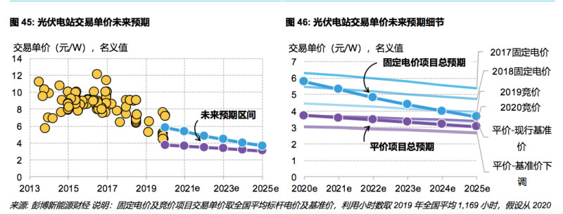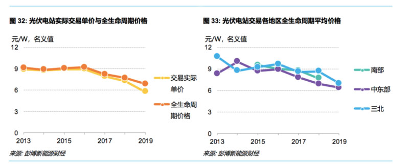 與此同時(shí),隨著可再生能源補(bǔ)貼政策的變革,由于年利用小時(shí)下的補(bǔ)貼方案導(dǎo)致電站收益有所下降,預(yù)計(jì)未來(lái)光伏電站的交易價(jià)格仍將持續(xù)下降,到2025年,光伏電站的平均交易單價(jià)可能將降至3.7元/W以下,最低預(yù)計(jì)在3元/W左右。