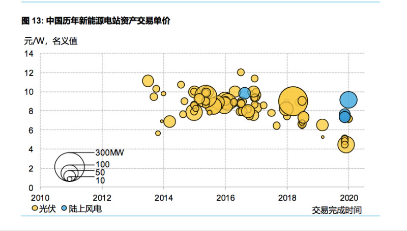 隨著風(fēng)、光平價(jià)時(shí)代的到來(lái),以及前七批補(bǔ)貼目錄外項(xiàng)目逐漸進(jìn)入補(bǔ)貼清單,未來(lái)五年中,光伏電站資產(chǎn)交易規(guī)模可能出現(xiàn)較大規(guī)模提升。基于往年交易規(guī)模占累計(jì)裝機(jī)比例進(jìn)行估計(jì),公開(kāi)披露的交易規(guī)??赡軓倪^(guò)去每年2-3GW上升至 5GW左右。