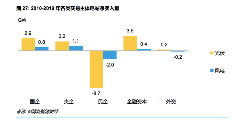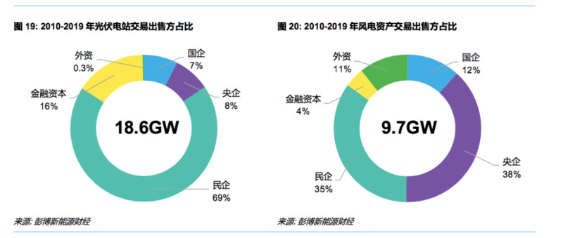 而收購(gòu)方則以國(guó)企、央企和金融資本為主。以熊貓綠能和江山控股為代表的金融資本在2013~2018年間大舉購(gòu)入光伏電站,收購(gòu)體量超6GW,占比34%。央企和國(guó)企也各自收購(gòu)了約4GW的光伏電站,總占比約43%,代表企業(yè)為申能、國(guó)投電力、五凌電力以及浙江新能源投資集團(tuán)等。