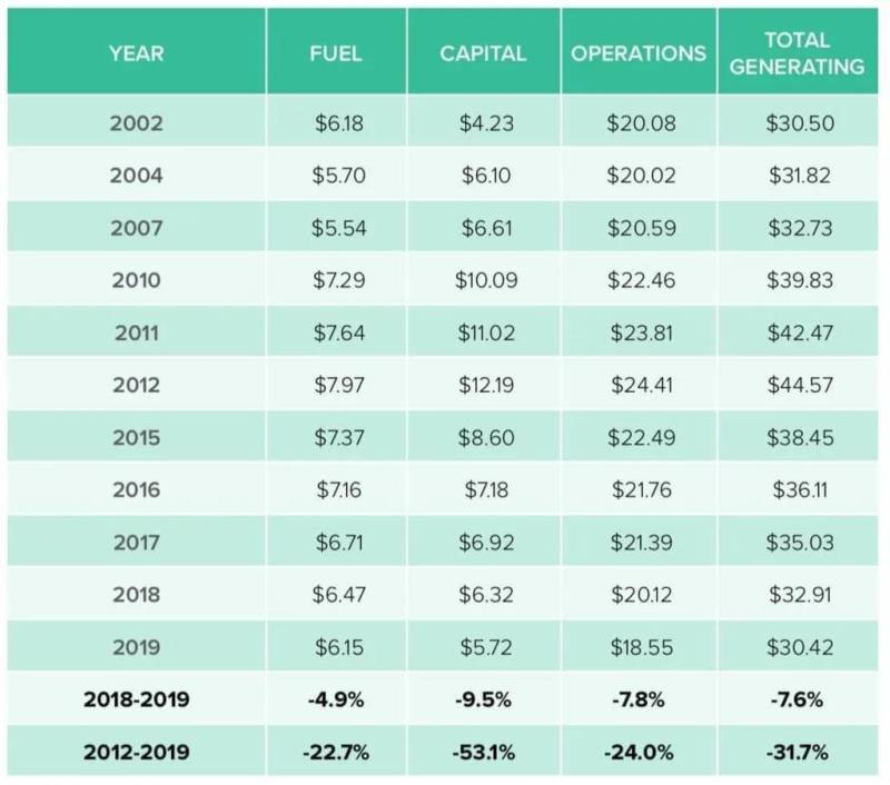 特別值得注意的是,資本成本大幅下降,與去年相比下降了近10%。運(yùn)營成本也大幅下降,降幅為7.8%,而燃料成本較2018年下降約4.9%。