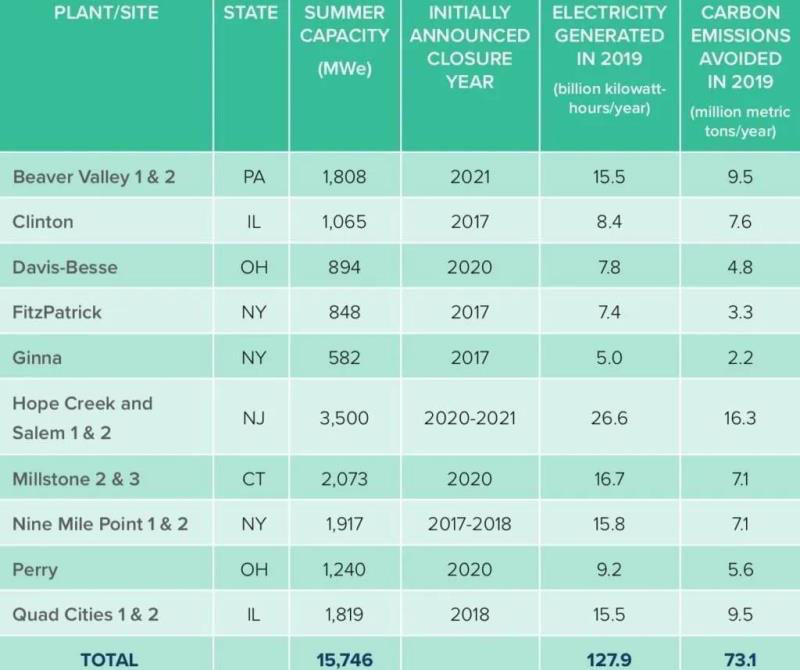 到2025年,至少還有6座5.7 GW反應(yīng)堆將加入退役大軍:愛荷華州杜安阿諾德反應(yīng)堆(總計(jì)601 MW)將于今年關(guān)閉;紐約的印第安2號(hào)、3號(hào)機(jī)組(總計(jì)2054 MW)將于2021年關(guān)閉;密歇根州的帕利塞德斯反應(yīng)堆(772 MW)將于2022年關(guān)閉;迪亞波羅峽谷1號(hào)、2號(hào)機(jī)組(總計(jì)2240 MW)將于2025年關(guān)閉。
