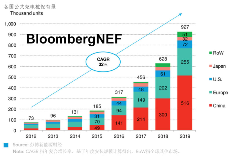 目前全球公共充電樁保有量達(dá)到92.7萬,其中2019年新增29.9萬,包括美國1.11萬,歐洲5.37萬和中國的21.6萬。