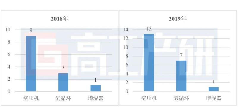 GGII認為,氫能與氫燃料電池產(chǎn)業(yè)在國內(nèi)也將參考并吸收以上路徑的部分經(jīng)驗與成果,從而加快國內(nèi)燃料電池產(chǎn)業(yè)的發(fā)展步伐。2019年國內(nèi)氫燃料電池空壓機實現(xiàn)百臺以上裝車出貨,氫循環(huán)、增濕器等還處于送樣測試階段,產(chǎn)品上車仍需時間。其他關(guān)鍵材料和部件方面,2019年國內(nèi)氣體擴散層的碳紙/碳布、質(zhì)子交換膜、催化劑等均未實現(xiàn)批量上車。2019年國內(nèi)空壓機和氫氣循環(huán)泵企業(yè)均新增4家,同時GGII調(diào)研發(fā)現(xiàn),2020年國內(nèi)市場向上游零部件和關(guān)鍵材料投資的積極性明顯提升。