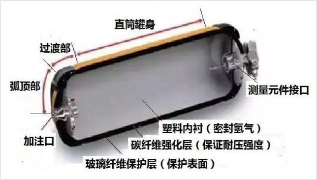 當前高壓氣態(tài)儲氫技術比較成熟,是目前最常用的儲氫技術。該技術是采用高壓將氫氣壓縮到一個耐高壓的容器里。儲氫罐主要由壓力部件金屬套筒、聚合物或金屬襯板、碳纖維增強層、防沖擊外罩和底座組成,可有效增強氣罐的抗沖擊能力,提高安全性,同時灌裝氫氣方便。