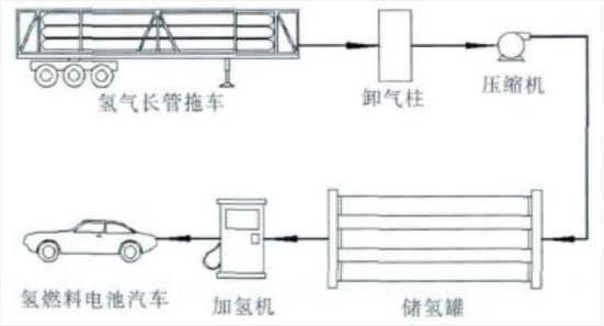 氫氣長管拖車將氫氣運輸至加氫站后,裝有氫氣的半掛車與牽引車分離并和卸氣柱相連接。隨后氫氣進入壓縮機內被壓縮,并先后輸送至高壓、中壓、低壓儲氫罐中分級儲存。需要對汽車進行加注服務時,加氫機可以先后從氫氣長管拖車、低壓儲氫罐、中壓儲氫罐、高壓儲氫罐中按順序取氣進行加注。