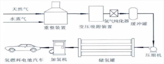 脫硫后的天然氣和水蒸氣在高溫、催化劑的條件下在重整裝置中反應生成氫氣、一氧化碳以及二氧化碳等。隨后通過變壓吸附裝置(PSA)將氫氣分離出來。分離出來的氫氣進一步在氫氣純化器中純化。本流程中純化的目的是進一步除去一氧化碳、二氧化碳、甲烷等雜質,以達到燃料電池汽車對氫氣質量的要求(氫氣體積分數(shù)>99.9999%)。
