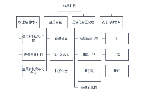 儲氫材料主要可分為物理吸附類材料、金屬合金氫化物材料、絡合化學氫化合物材料、液態(tài)有機儲氫材料等。碳質材料等物理吸附材料只能在較低溫度下有足夠的儲氫密度,常溫常壓下其吸氫量遠遠低于商用儲氫指標,并且制備碳納米材料技術尚不成熟;絡合化學氫化物儲氫密度較高,但材料的加氫/脫氫的可逆性、加氫/脫氫過程的副反應等都是亟待解決的重要問題。所以目前在眾多儲氫材料中最有望突出重圍的是金屬合金氫化物材料和液態(tài)有機儲氫材料。