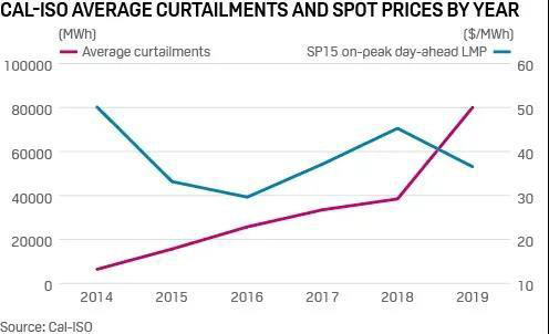 據(jù)ISO數(shù)據(jù)顯示,2019年CAISO的棄電量同比增長了一倍多,但SP15日前市場峰荷價(jià)格卻同比下降了近22%。