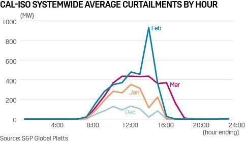 由于春季用電需求偏低,風(fēng)電和太陽能發(fā)電增加,同時(shí)受到春冬換季水電增發(fā)的影響,CAISO可再生能源季節(jié)性棄電增多。