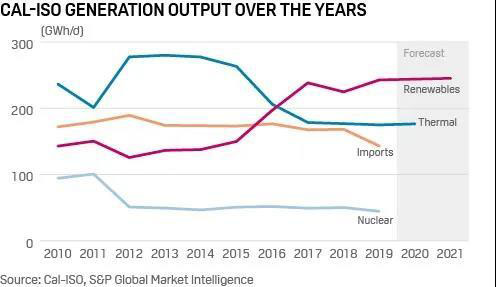 根據(jù)加州電力調(diào)度中心(CAISO)的數(shù)據(jù),可再生能源發(fā)電比例約為40%,處于全國領(lǐng)先水平,在過去十年中翻了一近番。與此同時(shí),2019年可再生能源棄電量同比增長了一倍多,同年5月創(chuàng)下月度棄電量223195 MWh的紀(jì)錄。