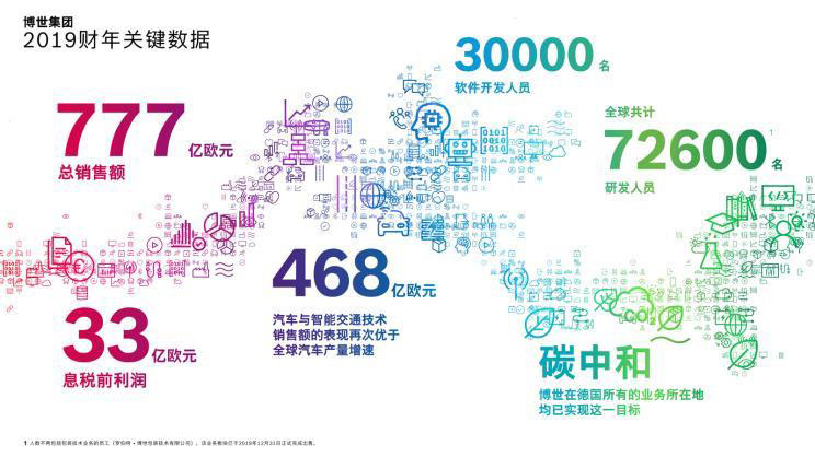 回顧2019財年,在全球經(jīng)濟發(fā)展持續(xù)低迷和汽車產(chǎn)量下降5.5%的大環(huán)境下,博世集團整體銷售額達777億歐元(約5967億元人民幣),息稅前利潤總計33億歐元(約253億元人民幣)。2019年博世集團研發(fā)支出61億歐元(約468億元人民幣),占整體銷售額7.8%。