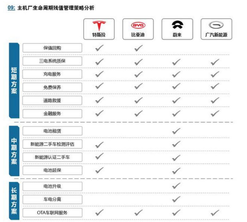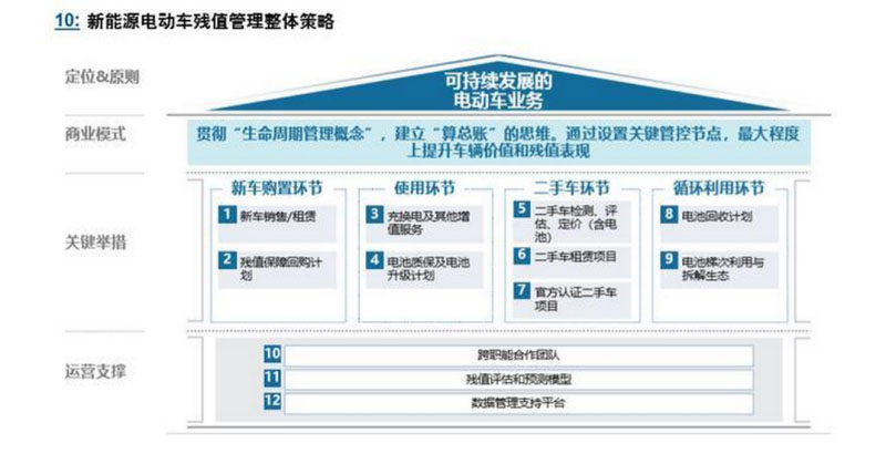 主機(jī)廠已經(jīng)針對新能源車殘值以及整個流通過程的特殊 性加以布局和考慮,但是體系化建設(shè)布局仍需加強(qiáng),應(yīng) 逐漸從“點狀”戰(zhàn)術(shù)性手段過渡到覆蓋車輛生命周期的 “鏈狀”戰(zhàn)略性管理體系。
