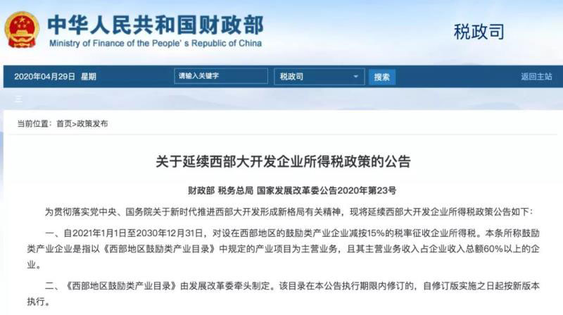 為貫徹落實(shí)黨中央、國(guó)務(wù)院關(guān)于新時(shí)代推進(jìn)西部大開(kāi)發(fā)形成新格局有關(guān)精神,現(xiàn)將延續(xù)西部大開(kāi)發(fā)企業(yè)所得稅政策公告如下:
