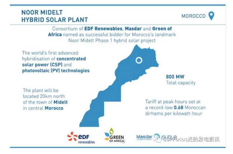 摩洛哥正在推進(jìn)建設(shè)的800MW Noor Midelt I光熱光伏太陽(yáng)能混合發(fā)電項(xiàng)目為摩洛哥太陽(yáng)能項(xiàng)目規(guī)劃(Morocco Solar Plan)的一部分,是繼580MW光熱光伏發(fā)電綜合體Noor Ouarzazate(NOORo努奧)之后第二個(gè)大型光熱+光伏發(fā)電項(xiàng)目。