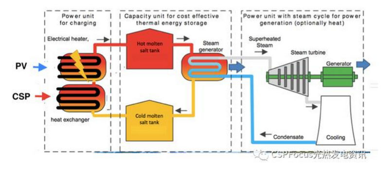 該技術(shù)思路的提出單位德國(guó)TSK Flagsol技術(shù)總監(jiān)Mark Schmitz也對(duì)此進(jìn)行了詳細(xì)解釋?zhuān)哼@是我們幾年前研發(fā)出的一個(gè)新概念,槽式光熱發(fā)電系統(tǒng)在正常運(yùn)行時(shí)的工作溫度約在400℃左右,而蒸汽溫度越高對(duì)汽輪機(jī)提升電站整體發(fā)電效率更有利,因此我們想到將光伏系統(tǒng)中的多余電力也放入儲(chǔ)熱罐中,熔鹽通過(guò)電加熱溫度可達(dá)到565℃左右,大大提高了發(fā)電效率。