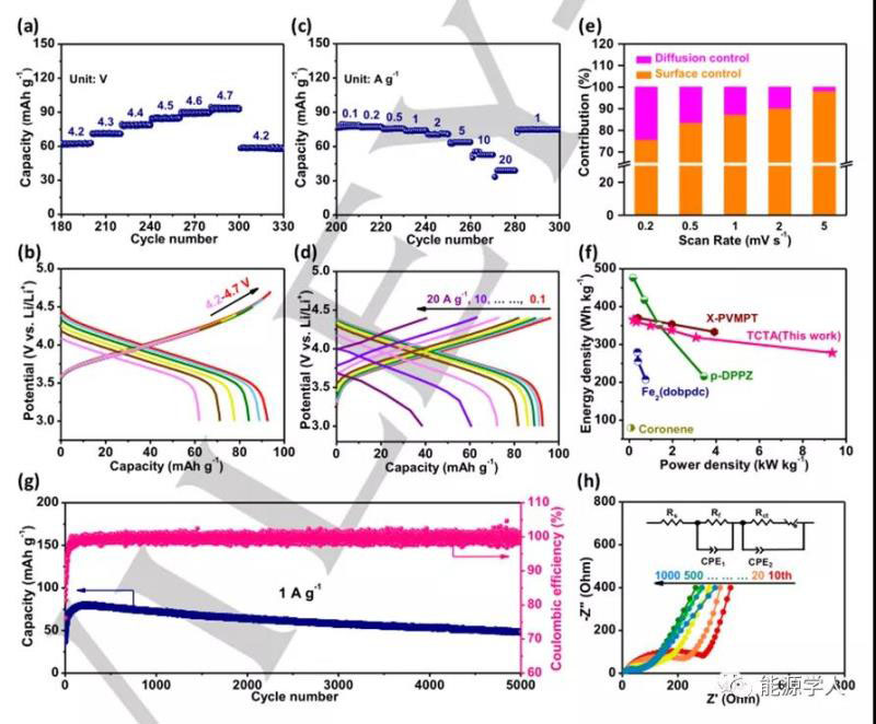 圖3.(a)分別在4.2至4.7 V的不同截止電壓下TCTA正極的循環(huán)性能和(b)相應(yīng)充電/放電曲線。(c)不同電流密度下TCTA正極的倍率性能和(d)相應(yīng)充電/放電曲線。(e)在不同掃速下擴(kuò)散控制和表面控制的容量貢獻(xiàn)率,(f)文獻(xiàn)中報(bào)道的TCTA和其他有機(jī)正極材料的性能比較,(g)TCTA正極在1 A g-1下的長期循環(huán)性能,(h)在500 mA g-1時不同周期的TCTA正極的EIS譜(內(nèi)部:等效擬合電路)。