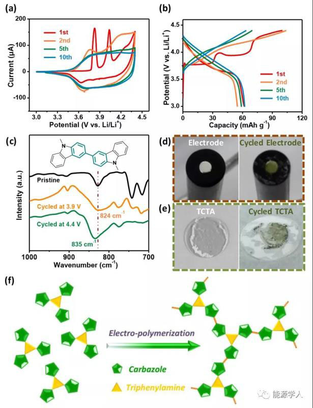 圖1 (a)0.1 mV s-1時的CV曲線(b)TCTA正極在200 mA g-1時的恒電流充/放電曲線,(c)TCTA正極在3.9 V和4.4 V循環(huán)前后的FT-IR光譜,(d-e)電化學(xué)循環(huán)前后的TCTA膜的示意圖,(f)電聚合過程的示意圖。