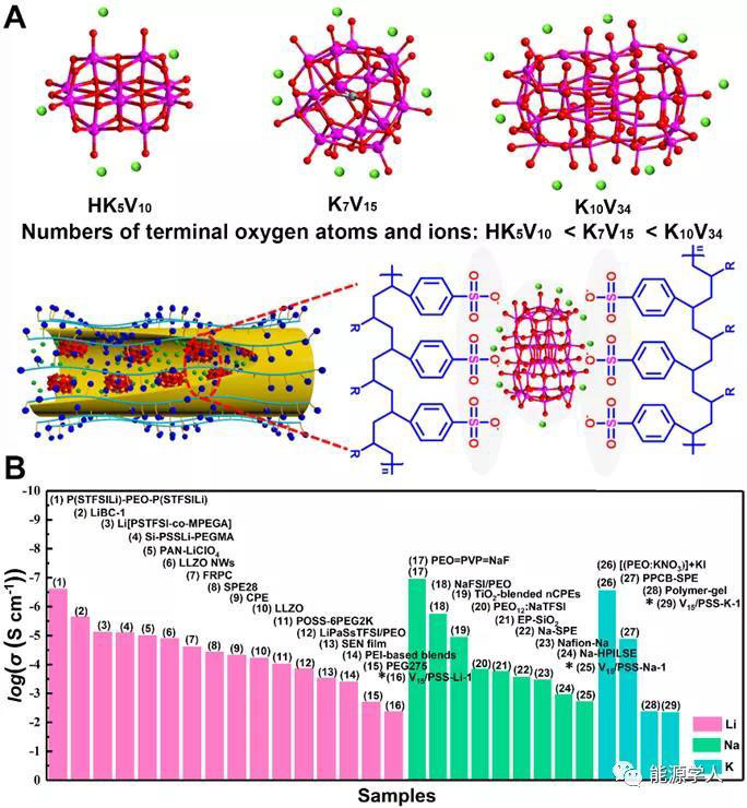 圖6.POVs/PSS的機(jī)理和性能比較圖。(A)不同的POVs末端氧原子和離子數(shù)目對比以及POVs/PSS可能的離子傳導(dǎo)路徑。(B)V15/PSS-Li-1,V15/PSS-Na-1,V34/PSS-K-1和其他具有代表性的基于聚合物的SPEs材料的離子導(dǎo)電率的比較圖,星號代表本工作中的材料。