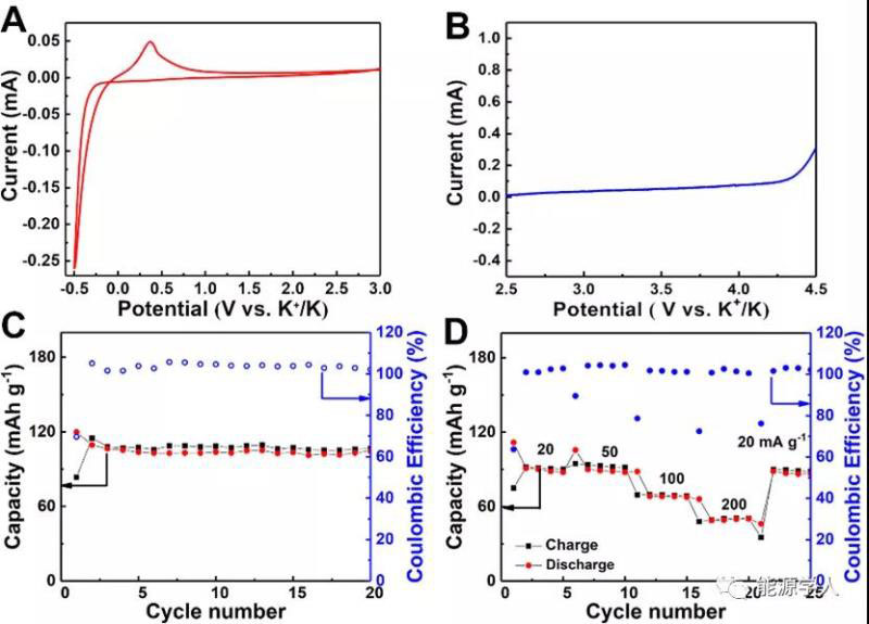 圖5. V34/PSS-K-1的CV,LSV圖和固態(tài)鉀電池測試。(A)掃描速度為1 mV s-1的CV曲線圖。(B)掃描速度為1 mV s-1的LSV圖。(C)在20 mA g-1的電流密度下,固態(tài)鉀電池的循環(huán)性能。(D)固態(tài)鉀電池在50至200 mA g-1的不同電流密度下的速率性能。