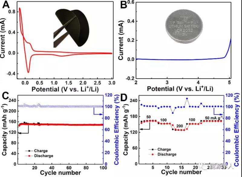 圖4. V15/PSS-Li-1的CV,LSV圖和固態(tài)鋰電池測試。(A)掃描速度為1mV s-1的CV曲線圖以及基于V15/PSS-Li-1的PVDF膜的照片(插圖)。(B)掃描速度為1mV s-1的LSV圖和紐扣電池的照片(插圖)。(C)在100mA g-1的電流密度下,固態(tài)鋰電池的循環(huán)性能。(D)固態(tài)鋰電池在50至200mA g-1的不同電流密度下的速率性能。
