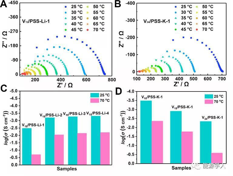 圖3. 所合成材料的阻抗圖譜。(A)V15/PSS-Li-1,(B)V34/PSS-K-1的阻抗圖。(C)V15/PSS-Li-n(n= 1-4),(D) V10/PSS-K-1, V15/PSS-K-1,和V34/PSS-K-1之間的離子導(dǎo)電率性能的對比圖。