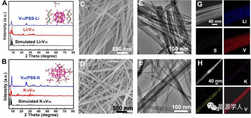 圖2. POVs/PSS的晶體結(jié)構(gòu)、PXRD、SEM和TEM圖。(A)模擬的Li7V15,Li7V15,V15/PSS-Li-1的PXRD圖和Li7V15的晶體結(jié)構(gòu)圖(插圖)。(B)模擬的K10V34,K10V34,V34/PSS-Li-1的PXRD圖和K10V34的晶體結(jié)構(gòu)圖(插圖)。(C),(D)V15/PSS-Li-1和V34/PSS-Li-1的SEM圖。(E)和(F)V15/PSS-Li-1和V34/PSS-Li-1的TEM圖。(G),(H)V15/PSS-Li-1和V34/PSS-Li-1的EDS-mapping圖。