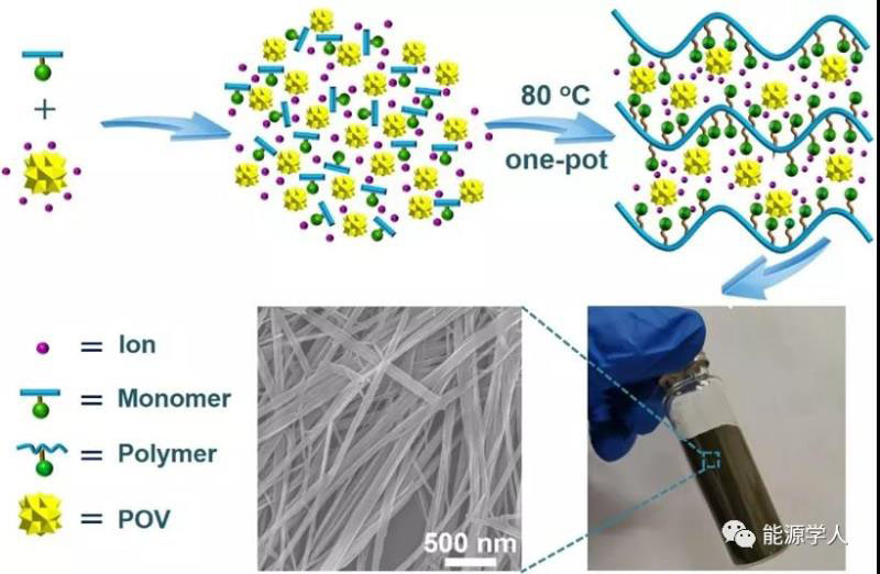 近日,南京師范大學(xué)蘭亞乾課題組和清華大學(xué)張強(qiáng)課題組合作利用簡單、可擴(kuò)展的多氧釩酸鹽(POVs)誘導(dǎo)自組裝方法(PISA)制備了一系列聚合物/多氧釩酸鹽雜化一維納米線材料并成功將其用于固態(tài)電池的電解質(zhì)。POVs作為一種多金屬氧簇(POMs)是由雜多陰離子和種類眾多的抗衡陽離子(Li+、Na+和K+)組成,這使得其在作為高效離子導(dǎo)電率材料方面具有潛在的前景。另外,POVs外表面上的大量末端氧原子(路易斯堿位點(diǎn))可以為堿金屬離子提供大量的傳輸位點(diǎn),從而解決了PSS作為固態(tài)電解質(zhì)的傳輸問題。此方法適用于各種抗衡陽離子(Li+、Na+和K+)和各種雜多陰離子([V10O28]5?、[V15O36(CO3)]7?和[V34O82]10?)的POVs。