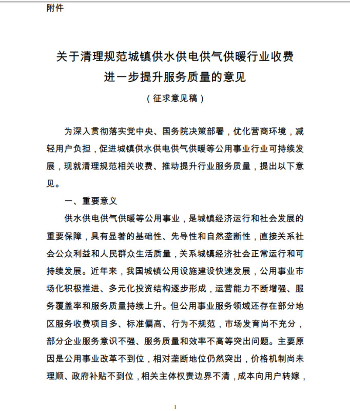 附件: 關于清理規(guī)范城鎮(zhèn)供水供電供氣供暖行業(yè)收費進一步提升服務質量的意見(征求意見稿)