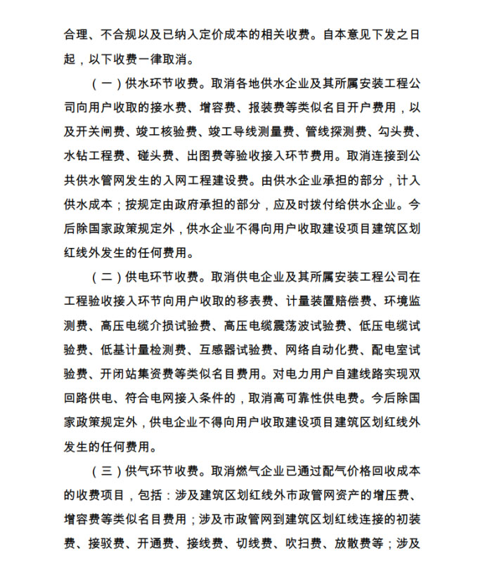取消供電企業(yè)及其所屬安裝工程公司在工程驗收接入環(huán)節(jié)向用戶收取的移表費、計量裝置賠償費、環(huán)境監(jiān)測費、高壓電纜介損試驗費、高壓電纜震蕩波試驗費、低壓電纜試驗費、低基計量檢測費、互感器試驗費、網(wǎng)絡自動化費、配電室試驗費、開閉站集資費等類似名目費用。對電力用戶自建線路實現(xiàn)雙回路供電、符合電網(wǎng)接入條件的,取消高可靠性供電費。今后除國家政策規(guī)定外,供電企業(yè)不得向用戶收取建設項目建筑區(qū)劃紅線外發(fā)生的任何費用。