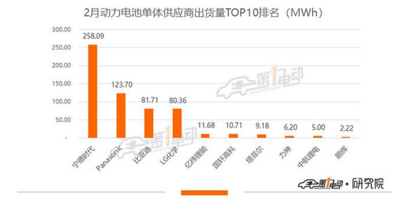 松下2月給2363輛特斯拉Model 3提供電池,共裝機(jī)123.7MWh,超越比亞迪排名第二。