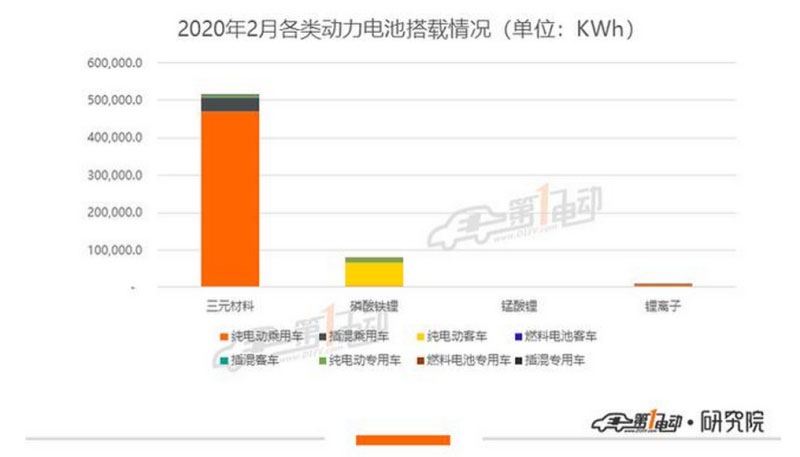 2月三元材料的搭載量為512.1MWh,其中乘用車占比99.3%,三元材料搭載量占總搭載量的85.8%。磷酸鐵鋰電池依然以搭載純電動動客車為主,2月總搭載量為76.6MWh,在月度裝機(jī)中的占比為12.8%。