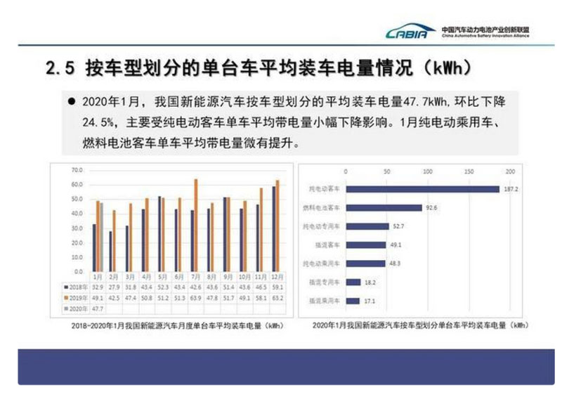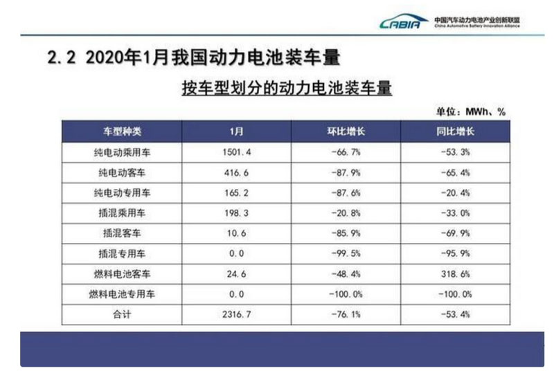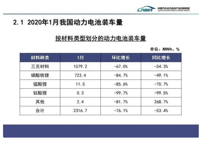 裝車量方面:2020年1月,我國(guó)動(dòng)力電池裝車量共計(jì)2.3GWh,同比下降53.4%,環(huán)比下降76.1%,年初呈現(xiàn)較大幅度下降。三元電池、磷酸鐵鋰電池裝車量分別為1.6GWh和0.7GWh,同比分別下降54.3%和49.1%。