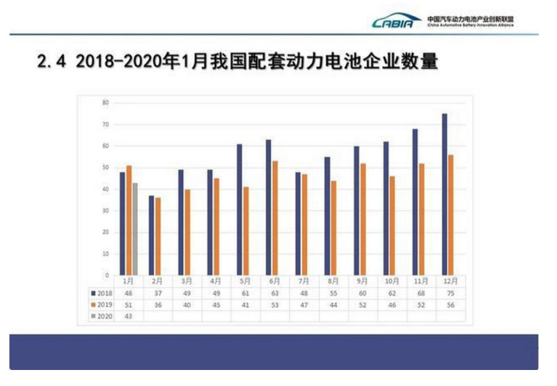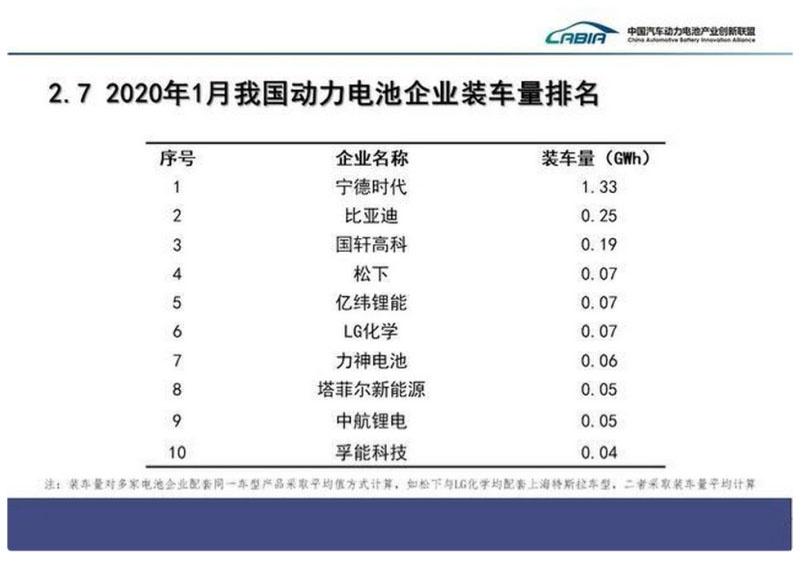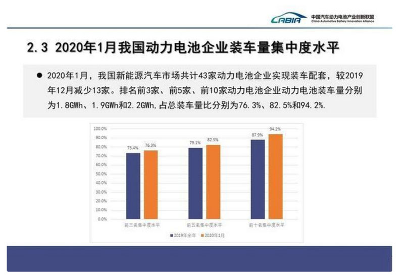 2020年1月,我國(guó)新能源汽車市場(chǎng)共計(jì)43家動(dòng)力電池企業(yè)實(shí)現(xiàn)裝車配套,較2019年12月減少13家。排名前3家、前5家、前10家動(dòng)力電池企業(yè)動(dòng)力電池裝車量分別為1.8GWh、1.9GWh和2.2GWh,占總裝車量比分別為76.3%、82.5%和94.2%。