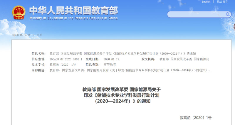 教育部 國家發(fā)展改革委 國家能源局關(guān)于印發(fā)《儲能技術(shù)專業(yè)學(xué)科發(fā)展行動計(jì)劃(2020—2024年)》的通知