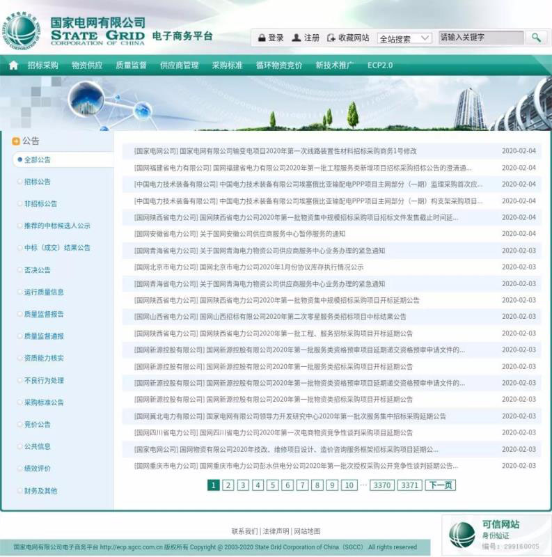 進(jìn)入2020年2月,國網(wǎng)電商平臺(tái)陸續(xù)發(fā)布了總公司及各個(gè)分公司招標(biāo)、開標(biāo)延期通知,此前已發(fā)布過具體招標(biāo)時(shí)間的各公司也大多修改了時(shí)間,具體投標(biāo)截止時(shí)間及集中遞交投標(biāo)文件時(shí)間另行通知。