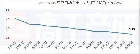 市場出現(xiàn)增量不增值的原因主要由于電池單體以及系統(tǒng)價(jià)格下降速度遠(yuǎn)大于電池單體出貨量增加速度。從季度價(jià)格走勢分布來看,2016-2019年整體價(jià)格呈現(xiàn)4%-10%不等的下降走勢,2019年電池單體價(jià)格下降走勢維持在5%-10%之間,較2018年下降幅度更大。2019年4季度動(dòng)力電池系統(tǒng)不含稅價(jià)格為0.82~0.95元/Wh,較2018年4季度動(dòng)力電池系統(tǒng)價(jià)格下降25.9%。GGII預(yù)測,2020年隨著電池系統(tǒng)集成化提升以及新工藝的使用,動(dòng)力電池價(jià)格有望進(jìn)一步下降。