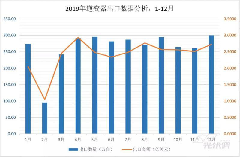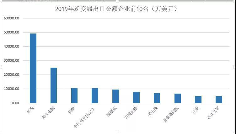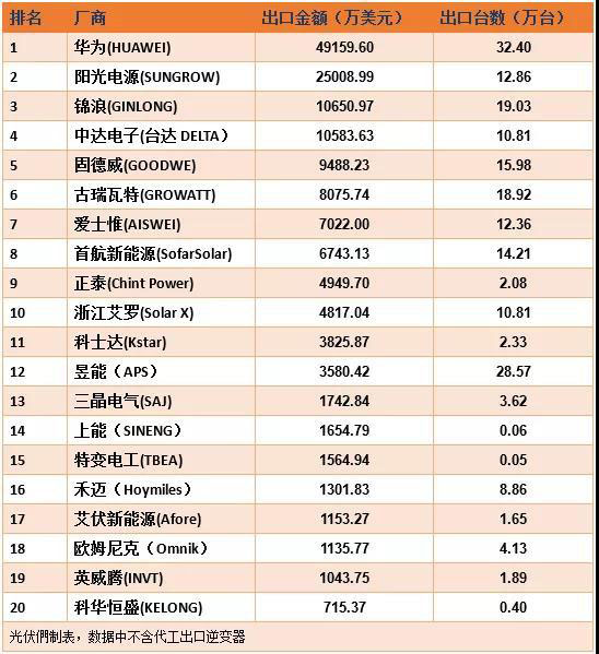 近日,2019年全年的海關(guān)數(shù)據(jù)已出爐,根據(jù)光伏們統(tǒng)計,2019年全年,中國的逆變器出口量約為3155.47萬臺,出口總金額達到了近29億美元(含光伏、風電、汽車電源等),前20家光伏逆變器公司的出口金額超過了總出口額的50%,約為15.42億美元。其中華為、陽光,錦浪,臺達,固德威位列2019年出口逆變器企業(yè)前五名。
