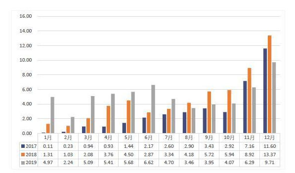 盡管動(dòng)力電池的產(chǎn)銷量差距并不大,但裝車量卻有一定差距,這在一定程度上跟動(dòng)力電池生產(chǎn)銷售早于車企新能源汽車的生產(chǎn)周期有關(guān)。2019年,動(dòng)力電池裝車量達(dá)到62.2GWh,同比累計(jì)增長(zhǎng)9.2%。盡管全年維持了正增長(zhǎng),但從月度數(shù)據(jù)看,動(dòng)力電池下半年感受到了明顯的壓力。從8月開始,動(dòng)力電池的月度裝機(jī)量都較去年有了不同程度的降低,12月降幅高達(dá)27.4%。