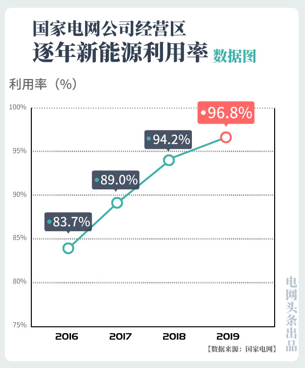 2019年,國(guó)家電網(wǎng)經(jīng)營(yíng)區(qū)域新能源并網(wǎng)容量、發(fā)電量分別增長(zhǎng)16.1%和16.5%,新能源利用率達(dá)96.8%,達(dá)國(guó)際先進(jìn)水平,同比上升2.7個(gè)百分點(diǎn),實(shí)現(xiàn)2017年、2018年、2019年三連升。其中,風(fēng)電利用率96.2%,同比上升3.3個(gè)百分點(diǎn),光伏利用率97.9%,同比上升1.5個(gè)百分點(diǎn)。