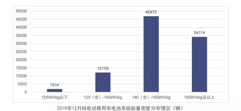 2019年12月,我國純電動乘用車系統(tǒng)能量密度在140Wh/kg及以上車型產(chǎn)量仍然占據(jù)主體,140(含)-160Wh/kg和160Wh/kg以上車型產(chǎn)量占純電動乘用車總產(chǎn)量比例分別為49.3%和35.9%,125Wh/kg以下車型12月產(chǎn)量稍有增長,占比提升至2.0%。