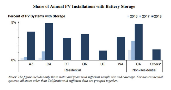 不過(guò),勞倫斯·伯克利國(guó)家實(shí)驗(yàn)室(LBNL)的調(diào)查發(fā)現(xiàn),分布式太陽(yáng)能與電池儲(chǔ)能系統(tǒng)配套部署比例雖然很小,但在不斷增加。主要市場(chǎng)去年的部署量從1%到5%不等,但在夏威夷的部署超過(guò)了60%。其驅(qū)動(dòng)因素包括儲(chǔ)能系統(tǒng)成本下降、客戶尋求可靠性以防電力中斷,以及提供新的公用事業(yè)政策激勵(lì)措施等。