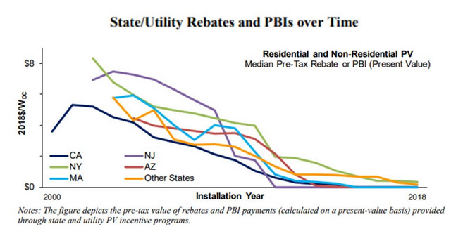 勞倫斯·伯克利國(guó)家實(shí)驗(yàn)室(LBNL)的調(diào)查表明:“自2000年以來(lái),太陽(yáng)能發(fā)電設(shè)施裝機(jī)成本每年下降0.5美元/W,但是,這已經(jīng)被相應(yīng)的折扣或其他激勵(lì)措施所抵消?!?