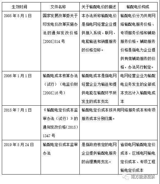 電化學(xué)儲(chǔ)能在電力系統(tǒng)內(nèi)可以承擔(dān)多種應(yīng)用,對(duì)于電網(wǎng)側(cè)儲(chǔ)能,有的應(yīng)用屬于輔助服務(wù)的范疇,如調(diào)峰調(diào)頻、冷熱備用、黑啟動(dòng)等;有的屬于輸配電服務(wù)范疇,如延緩線路擴(kuò)容、緩解線路阻塞、調(diào)壓和輸電線路熱管理等。而電力資產(chǎn)通過(guò)電價(jià)疏導(dǎo)的方式主要有兩種,一是“準(zhǔn)許成本+合理收益”的方式;另外一種方式是通過(guò)市場(chǎng)的方式,價(jià)格高低由供需關(guān)系決定。若電化學(xué)儲(chǔ)能只從事輸配電服務(wù)相關(guān)的業(yè)務(wù),其成本應(yīng)該被計(jì)入輸配電價(jià);而從事輔助服務(wù)這部分成本對(duì)應(yīng)的電價(jià)則是輔助服務(wù)電價(jià)。只是到目前為止,輔助服務(wù)機(jī)制(市場(chǎng))還是各種發(fā)電機(jī)組之間的“零和游戲”,現(xiàn)行輸配電價(jià)中不包含輔助服務(wù)電價(jià)。按照國(guó)家能源局發(fā)布的輔助服務(wù)市場(chǎng)推進(jìn)的時(shí)間表來(lái)看,這部分成本最終將疏導(dǎo)到終端電價(jià)。筆者查閱了2002年以來(lái)關(guān)于輸配電價(jià)構(gòu)成的相關(guān)政策,如下表所示: