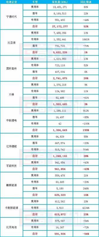 值得注意的是,在動力電池裝機(jī)量排名前十企業(yè)中,僅比克、孚能兩家企業(yè)裝機(jī)電量較去年同期出現(xiàn)下降,其余八家企業(yè)均保持不同程度的增長。