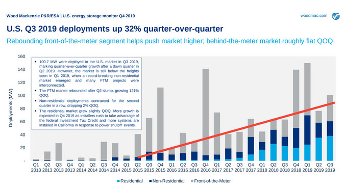 Wood Mackenzie公司和美國(guó)儲(chǔ)能協(xié)會(huì)日前已經(jīng)聯(lián)合發(fā)布了美國(guó)儲(chǔ)能部署監(jiān)測(cè)調(diào)查報(bào)告,該調(diào)查報(bào)告表明,美國(guó)2019年第三季度部署了100.7MW/264MWh儲(chǔ)能系統(tǒng),創(chuàng)造新的季度部署記錄。當(dāng)結(jié)合各種市場(chǎng)增長(zhǎng)因素時(shí),它處于持續(xù)增長(zhǎng)的末尾(例如紅線所示)。