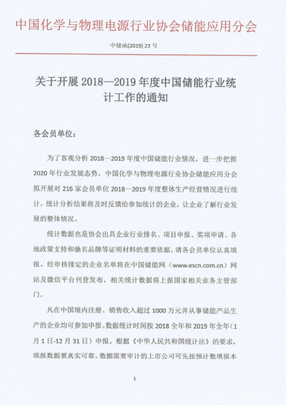 為了客觀分析2018—2019年度中國儲能行業(yè)情況,進(jìn)一步把握2020年行業(yè)發(fā)展態(tài)勢,中國化學(xué)與物理電源行業(yè)協(xié)會儲能應(yīng)用分會擬開展對216家會員單位2018—2019年度整體生產(chǎn)經(jīng)營情況進(jìn)行統(tǒng)計,統(tǒng)計分析結(jié)果將及時反饋給參加統(tǒng)計的企業(yè),讓企業(yè)了解行業(yè)發(fā)展的整體情況。