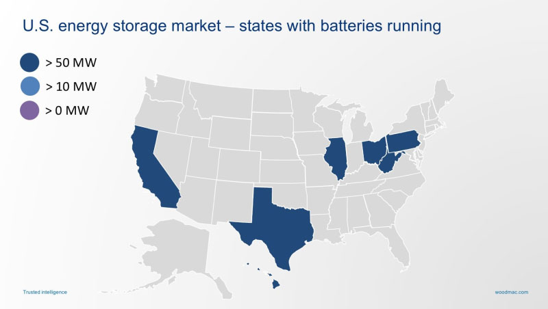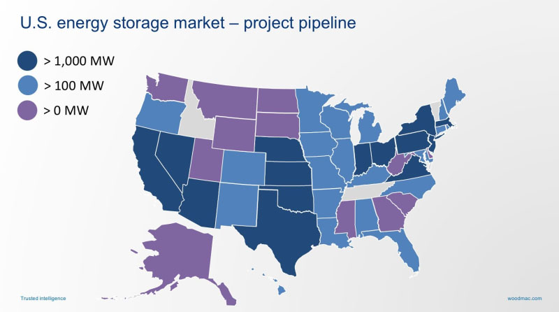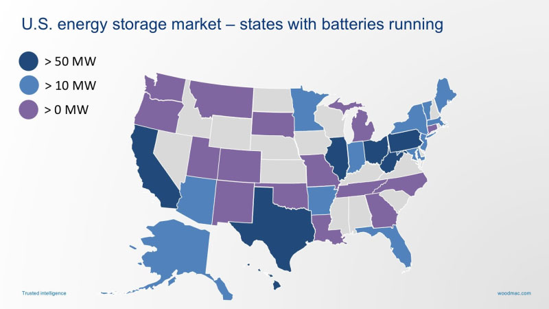 調(diào)研機構(gòu)Wood Mackenzie公司儲能主管Daniel Finn-Foley表示,儲能技術(shù)在電網(wǎng)應用中扮演著一些重要角色:頻率調(diào)節(jié)、提供容量、推遲電力線路升級改造、提高電網(wǎng)彈性、解決可再生能源間歇性等。電池儲能系統(tǒng)不依賴于特定地理位置的天氣模式或任何政策,并且已經(jīng)在美國各地能源部署中確立了自己的地位。